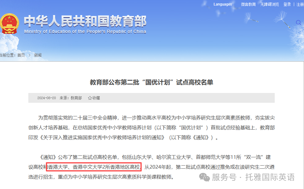 01 什么是“国优计划”? “国优计划” 全称为国家优秀中小学教师培育计划,核心是为国家选拔并培养优秀中小学教师的专项项目。 该计划主要面向两类人群:一是应届本科理工科毕业生,二是在读理工科硕士研究生。 入选学生可学习人工智能、STEM(科学、技术、工程、数学)等前沿课程,且会直接进入试点高校深造。完成规定课程后,有项重磅福利 —— 无需参加中小学教师资格考试,就能直接获得内地教师认证,顺利开启教学生涯。 更值得关注的是,符合条件的理工科研究生完成学业后,除了能拿到原本的理工科硕士学位,还能同步获得教育硕士学位。 这是国内首个可同时授予两个研究生学位的项目,相当于 “一份投入,两份收获”,让学生既拥有扎实的理工科知识,又掌握专业的教育教学技能。 此外,“国优计划” 内的内地研究生还有专属优势:他们有机会赴香港开展跨校学习与交流,拓宽国际视野;若表现突出,还能获得在香港任教的机会,实现学业与就业的无缝衔接。 据香港教育局信息,香港大学和香港中文大学的首批 “国优计划” 学生,将于 2025/26 学年入学。这意味着,从 2025 年秋季入学申请(即 25fall)起,大家就能报名参与 “国优计划”。 ✅推免 “直通车” 若你是本科阶段的优秀学生,且已获得推免资格,可直接申请试点高校的 “国优” 研究生项目,通过审核即可加入。 ✅研究生 “二次遴选” 若你已是非教育类在读研究生,也可凭借优异成绩、出色的面试表现及教学潜力,通过遴选进入计划。 换句话说,即便是香港大学、香港中文大学的在读学生,也能 “中途转型”,搭上成为教师的快车道! 02 “国优计划”政策解读 “国优计划” 政策出台后,不少同学和家长第一反应是:有了教师资格证,是不是毕业人人都能拿到教师编制?甚至有人觉得,“国优计划” 能让每个学生都稳获编制。 💡“国优计划”= 人均有编制吗? 实际并非如此,目前无法确定 “国优计划” 学生毕业后都能获得教师编制。 2023 年首批 “国优计划” 文件中,仅重点提及 “就业优待”,并未作出 “教师编制” 的承诺。 所以,不是所有参与计划的学生毕业后都能顺利拿到编制,具体还要看后续政策的调整与变化。 不过大家也不用太失望,“国优计划” 学生在就业上仍有不少优势。2023 年的《意见》明确提出,国家不仅为其开通教师就业 “绿色通道”,还鼓励中小学提前与其签约。在就业市场中,他们往往更受认可、更容易脱颖而出。 💡“国优计划” 毕业后的工作地在哪里? 不少学生格外关心 “国优计划” 毕业后的工作地点,毕竟大家都想留在条件好、发展机会多的地方,没人愿意被 “分配” 到偏远地区。 需要明确的是,“国优计划” 不会强制把毕业生安排到固定区域。通常是试点高校先与优质中小学签订合作协议,通过这种方式吸引毕业生入职。而毕业生拥有自主选择权,能根据自己的意愿,从这些合作学校中挑选心仪的去处。 💡毕业必须当老师吗? 简单来说,“国优计划” 并不强制要求学生毕业后必须当老师。它更偏向于一种支持和鼓励,而非硬性规定。毕业后,你可以自由选择 —— 无论是走进教室当教师,进入企业工作,还是继续读书深造,决定权完全在自己手中。 换句话说,这个计划多给了你一张 “教师资格证”,但用不用、怎么用,都由你自己决定。 03 港大与港中文录取要求及偏好 香港大学,简称港大(HKU),是亚洲顶尖学府之一,2024QS 世界大学排名第 11 位。自创办以来,港大始终以英语为主要教学语言,是一所覆盖多学术领域的综合性知名高校。 ▫️学历背景:需持有本科或同等学历学位 ▫️语言成绩:托福总分 80+,或雅思总分 6.0(单项不低于 5.5) ▫️均分要求:985/211 院校学生最低 85+,双非院校学生最低 87+ ▫️额外要求:部分专业对英文水平有更高标准,部分专业需提供工作经验或 GMAT 成绩 ▫️优先青睐 985/211 院校及海外本科背景学生,尤其商科专业 ▫️双非学生若均分高且软背景(如实习、科研)突出,可尝试申请社科或理工科 ▫️核心考察维度:院系背景、GPA、申请文书、实践经验,双非学生需在学术能力与软背景上双重发力才更具竞争力 香港中文大学(CUHK)是亚洲顶尖、享誉国际的公立研究型综合大学,也是香港唯一采用书院联邦制的高校,2024QS 世界大学排名第 32 位。 ▫️学历背景:需持有本科或同等学历学位 ▫️语言成绩:托福总分 80+、雅思总分 6.5+,或大学英语六级 430+ ▫️均分要求:985/211 院校学生 80-85+,双非院校学生 85-87+ ▫️额外要求:个别院系或专业对英文水平有更高要求,部分专业需提供工作经验证明 ▫️作为香港前三高校,是双非学生录取率最高的院校 ▫️985/211 学生申请有天然优势,双非学生可选择非热门专业提升成功率 ▫️商科专业申请大多需提交 GRE/GMAT 成绩,理工科专业申请难度相对较低 因此,“国优计划” 为港大与港中文学生提供了难得的发展机遇,双学位加持能为就业提供多重保障。目前该计划申请正火热进行中,无论你倾向留港寻求高薪工作,还是返回内地进入体制内发展,它都是一个能助力职业高起点的重要平台。 想要冲刺港大、港中文,雅思成绩是绕不开的关键门槛。稳定拿下 6.0 + 甚至 6.5 + 的分数,不仅能满足申请基础要求,更能在众多申请者中凸显竞争力,让你的材料在初审阶段就脱颖而出。